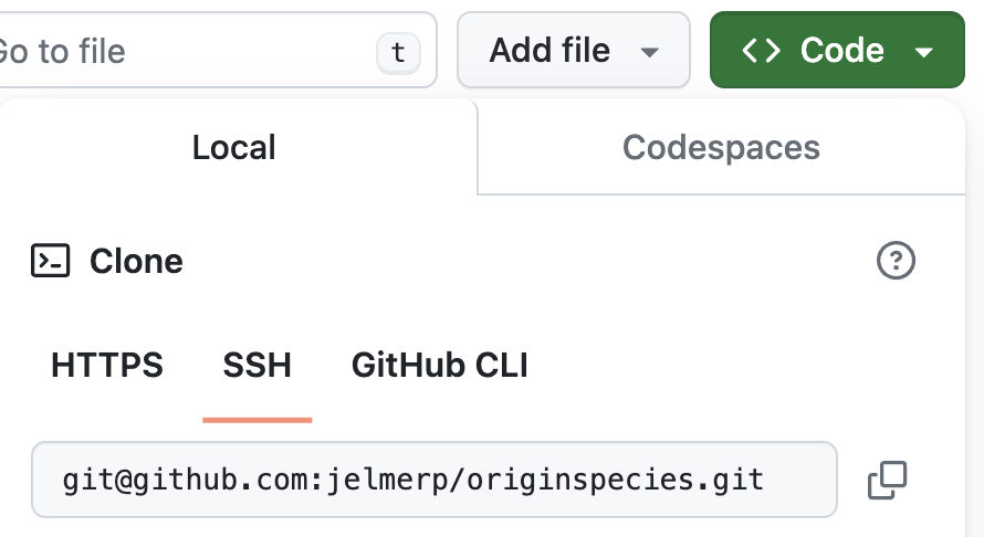 button. Make sure you get the SSH URL (rather than the HTTPS URL), and click the clipboard button next to the URL to copy it: