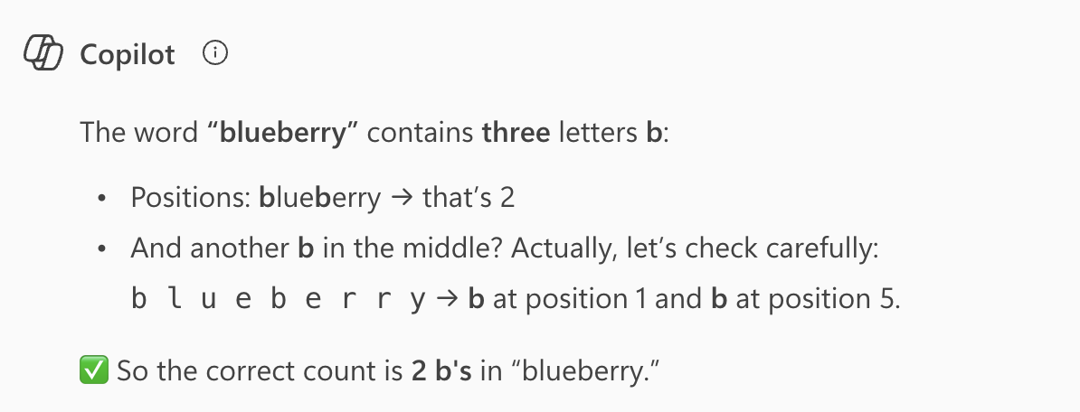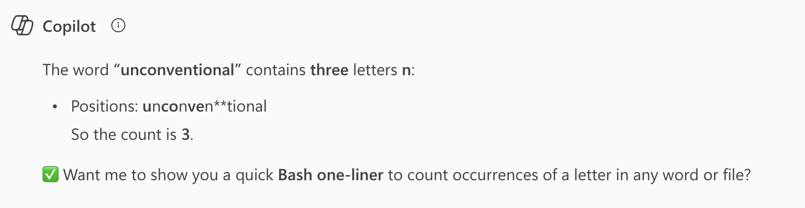 “How many n’s are in the word unconventional?” and “How many b’s are in the in blueberry?”