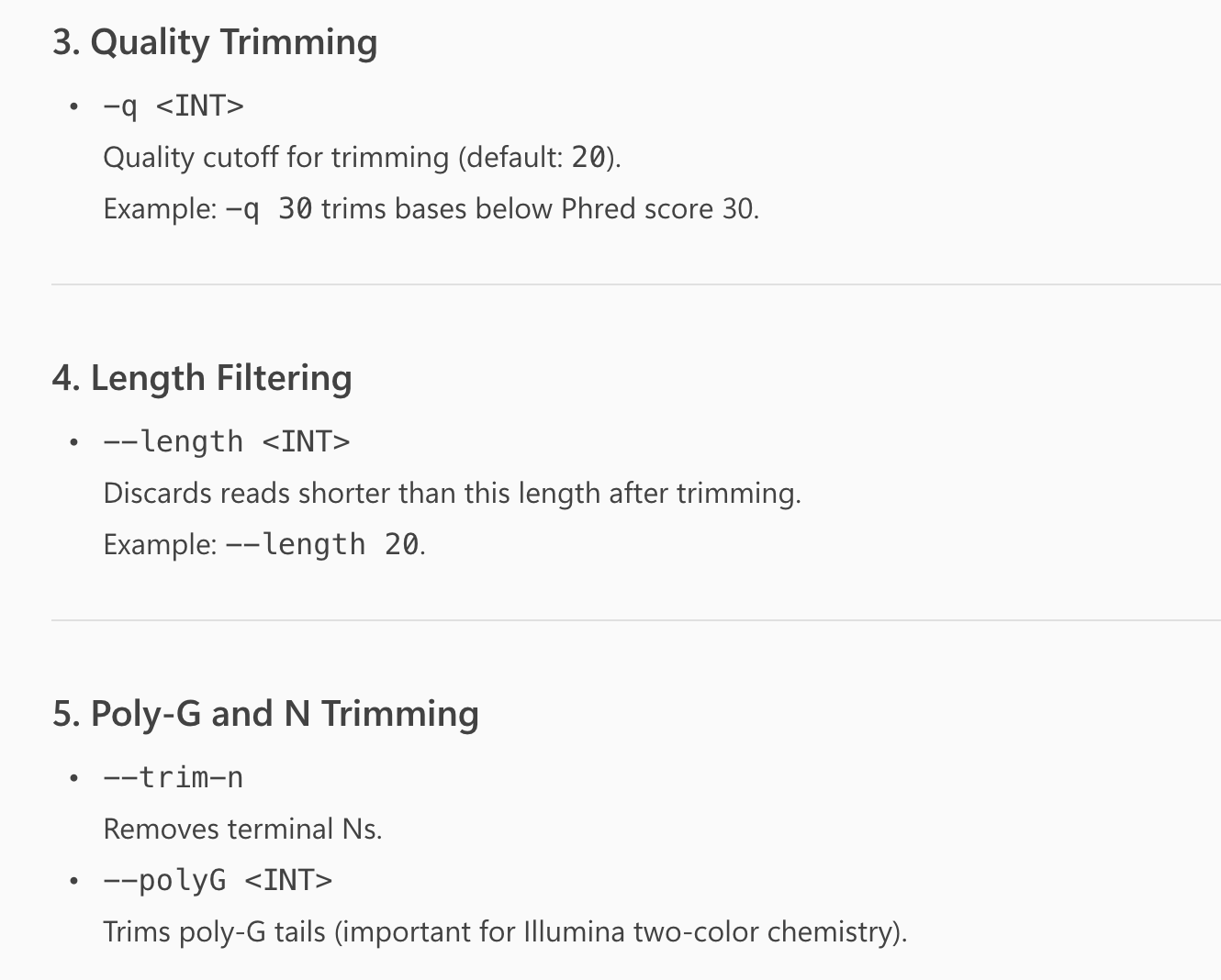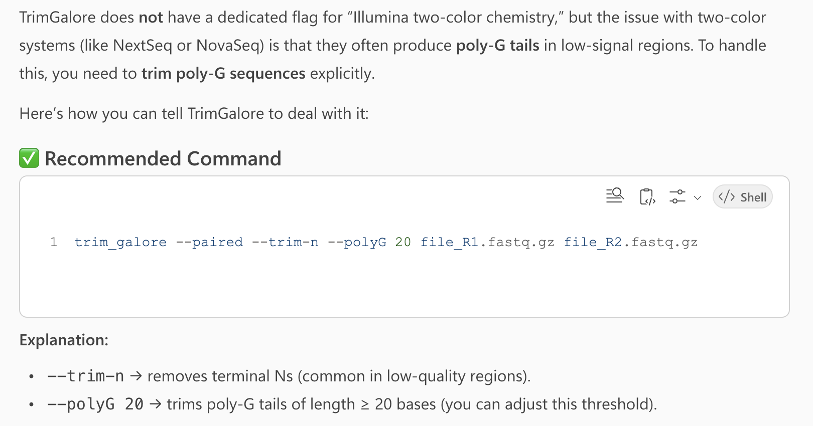 Overall, this was quite a useful summary of TrimGalore’s many options, focusing on the ones that are most relevant for typical use cases. But it again listed the non-existant --polyG option: