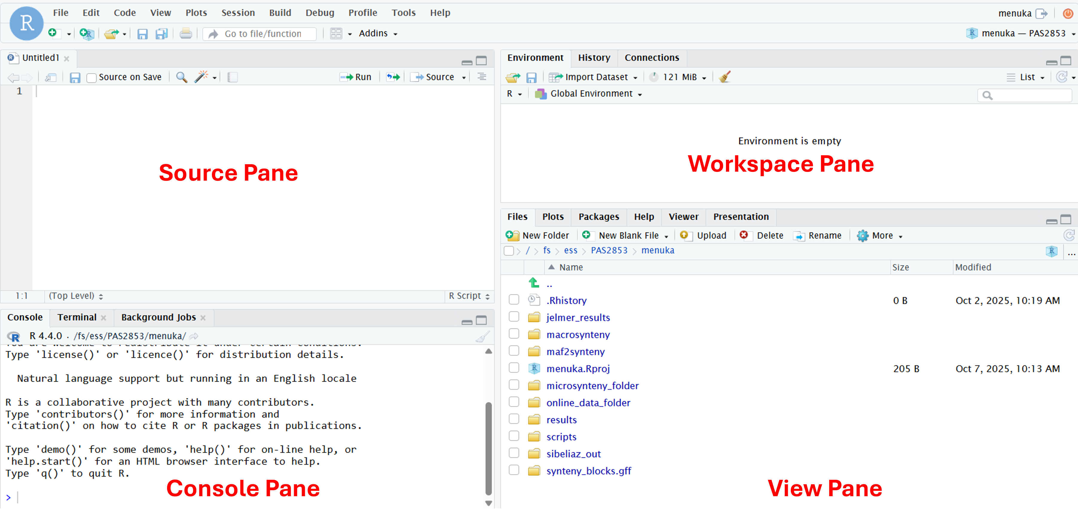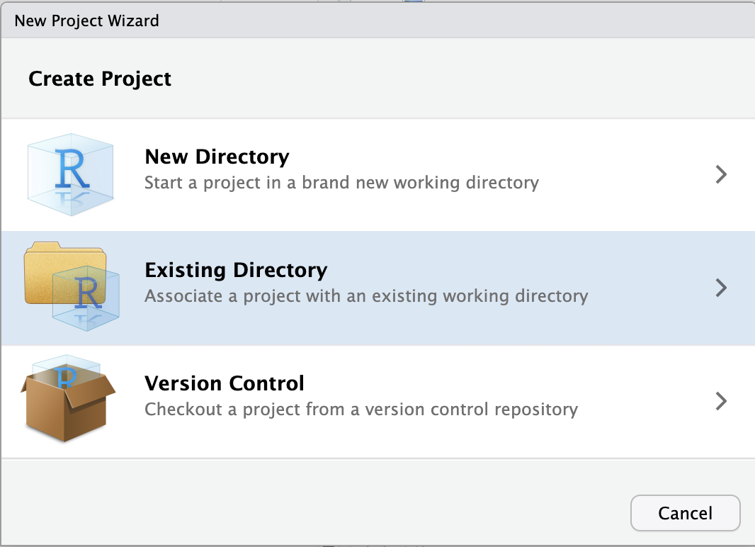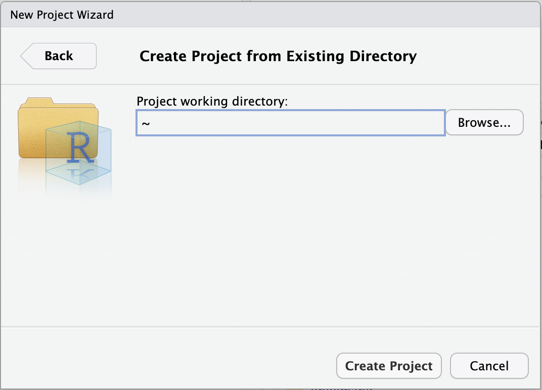 /fs/ess/PAS2880/users/$USER).Choose to pick your selected directory.Create Project.This will make R restart, which is by design. When R restarts, all objects are removed from the environment, packages are unloaded, and so on. This is a good idea whenever you switch to a different project, for example to avoid irreproducible carry-over effects.