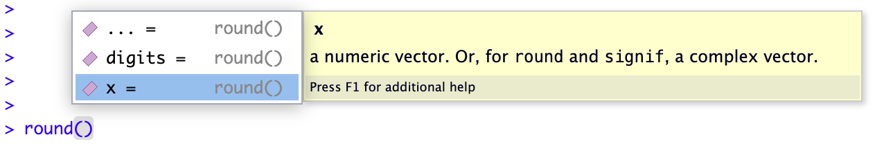 You can usually see which arguments a function takes by pausing after your type the function and its parenthesis, e.g. round():