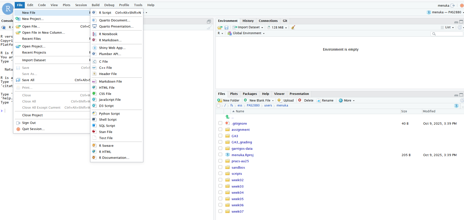 Create and open a new R script by clicking File (top menu bar) > New File > R Script.
