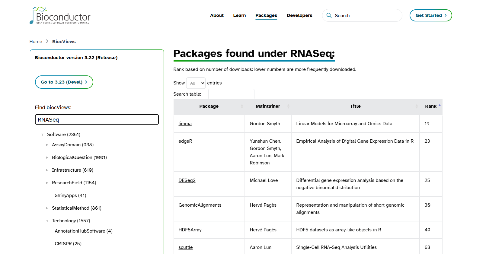 Rank column usually indicates the popularity or relevance of the package within Bioconductor, based on download statistics, usage in workflows, community interest. edgeR and DESeq2 are two most commonly used package for the differential expression analysis of RNA-seq dataset. They are ranked 23 and 25, respectively, meaning both packages are among the most downloaded in the Bioconductor project, with edgeR having a slightly more popularity.